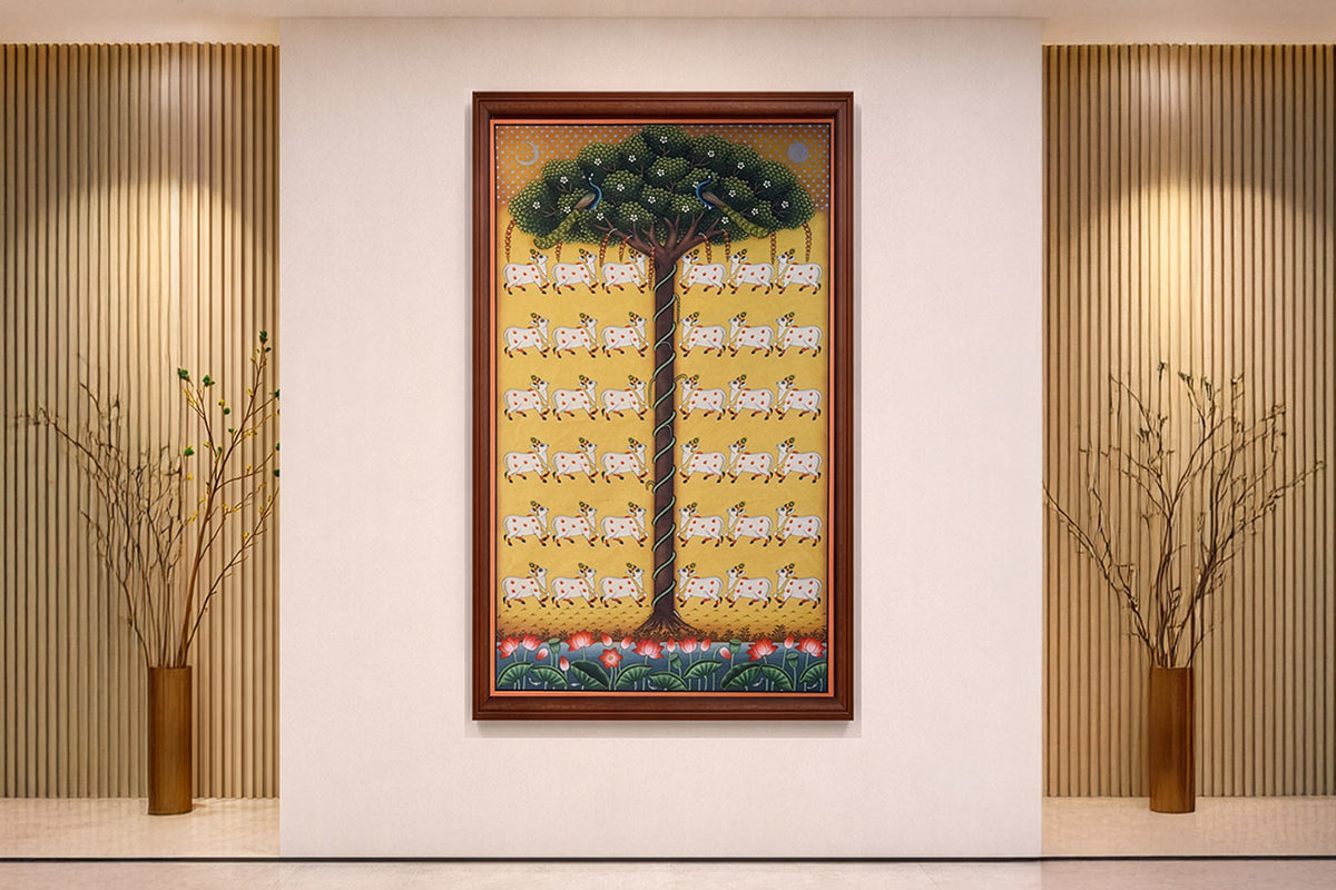Around this sacred tree move multiple forms of Kamadhenu — the divine cow of Vedic scriptures. She is not portrayed once, but many times.
