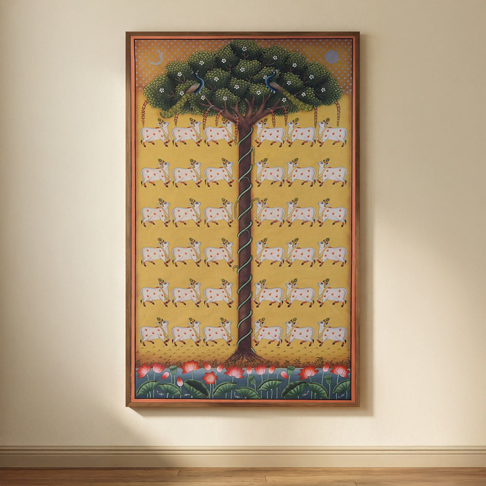 Original Handmade Kamadhenu Tree of Life Painting (3x4 Ft) – Sacred Vastu Cow Artwork