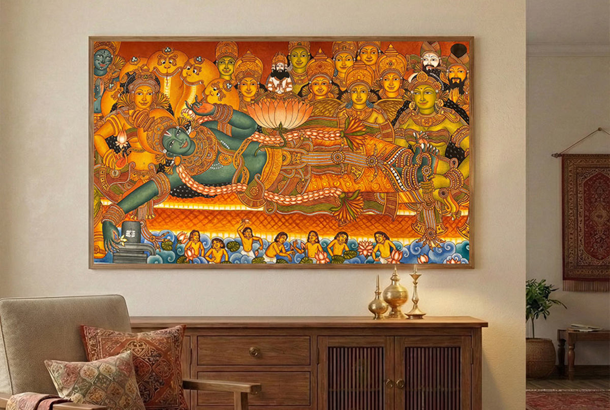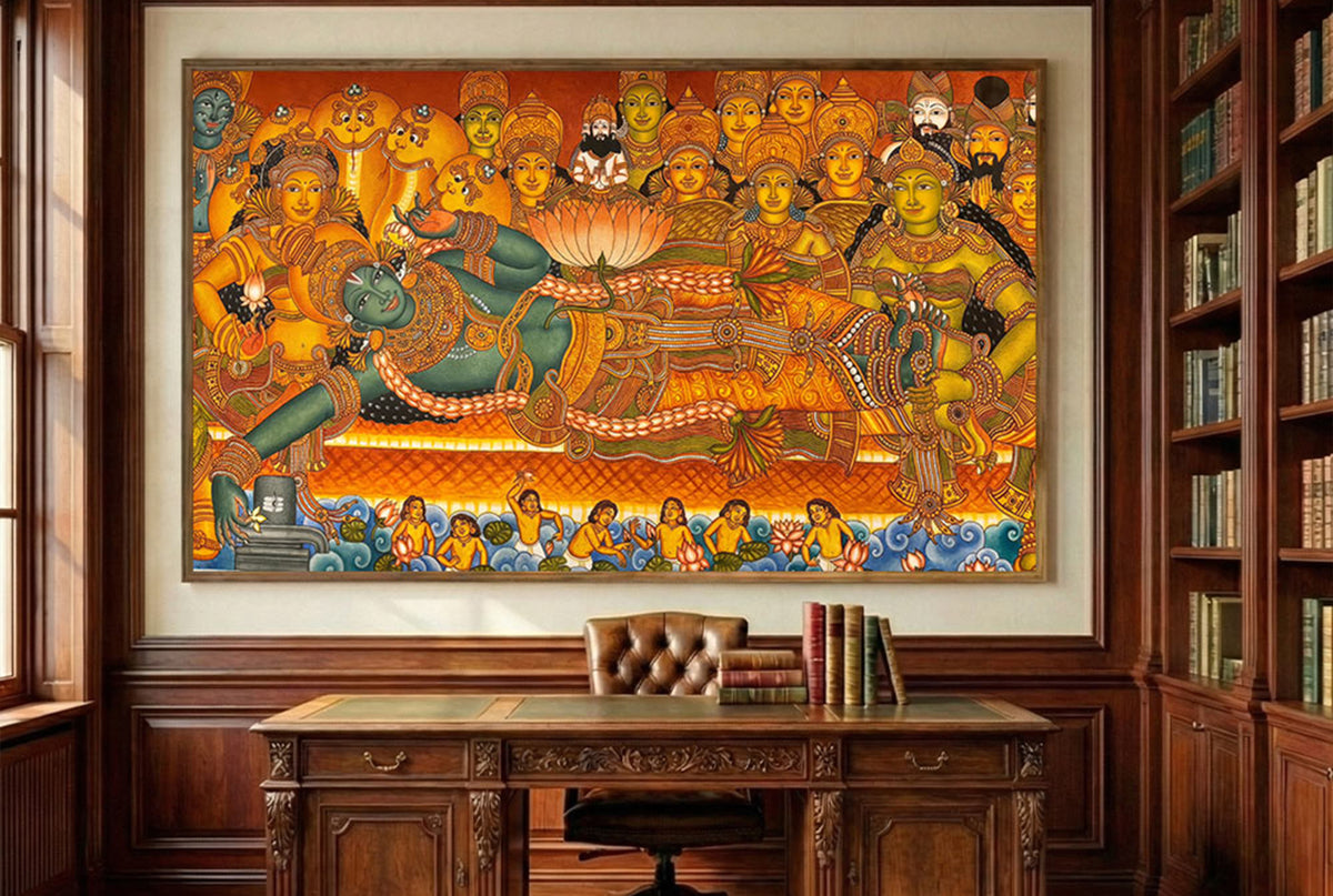 At the heart of the composition lies Anantashayana Vishnu, reclining upon Sheshnag, the infinite serpent, floating over the eternal Ksheer Sagar. This is not a depiction of sleep, but of Yoga-Nidra — a divine stillness so profound that from it, all creation arises effortlessly.